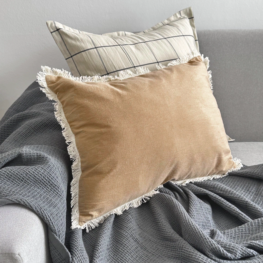 Este encantador almohadón con flecos es el complemento perfecto para añadir un toque de estilo y confort a cualquier espacio de tu hogar. Está confeccionado con una funda de tusor liviano de algodón 100%, teñido en un color avellana, y está decorado con hermosos flecos de algodón crudo que le brindan un toque de elegancia y distinción.